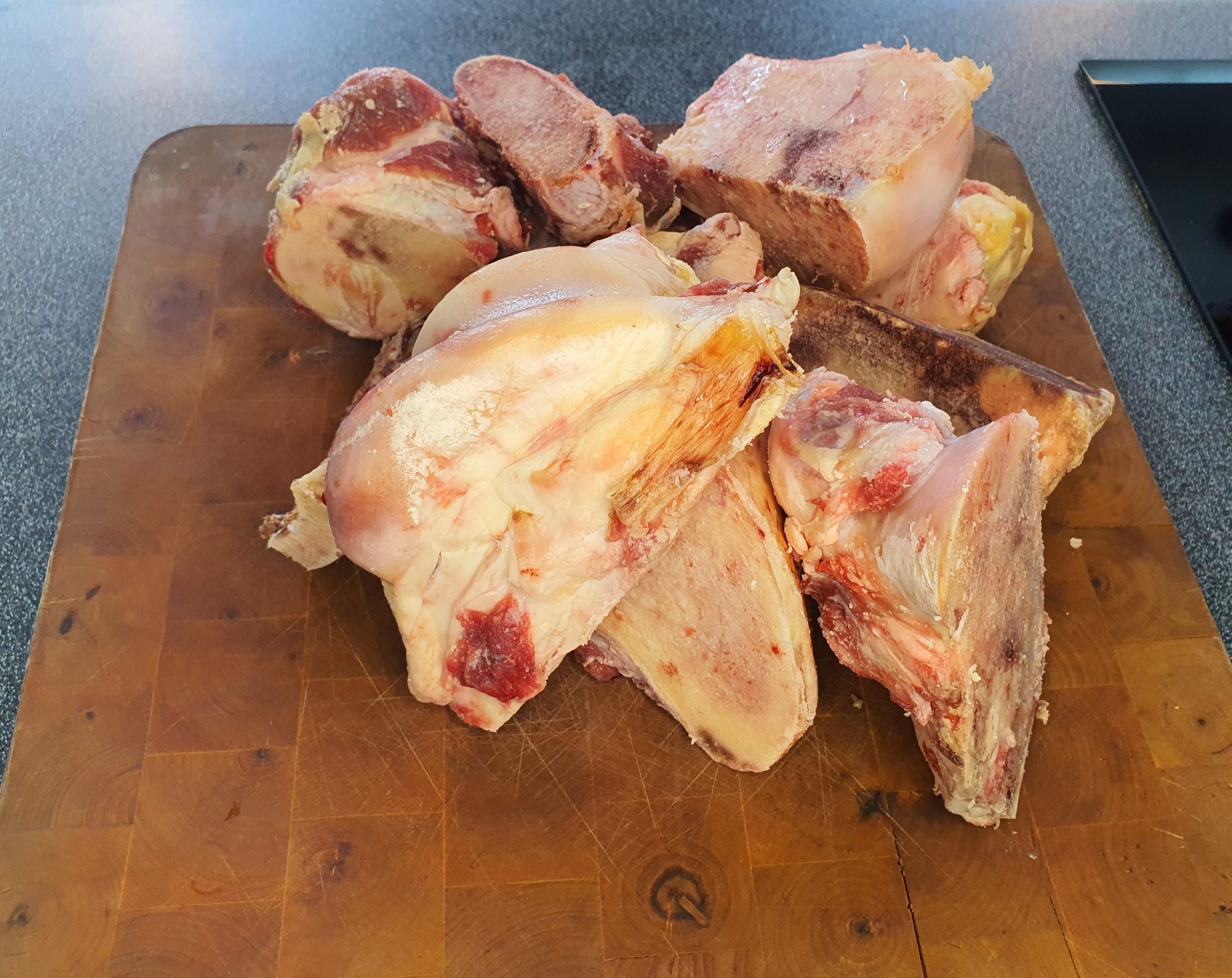 Usortert blanding av bein, knoker og piper. Egnet til å koke kraft.