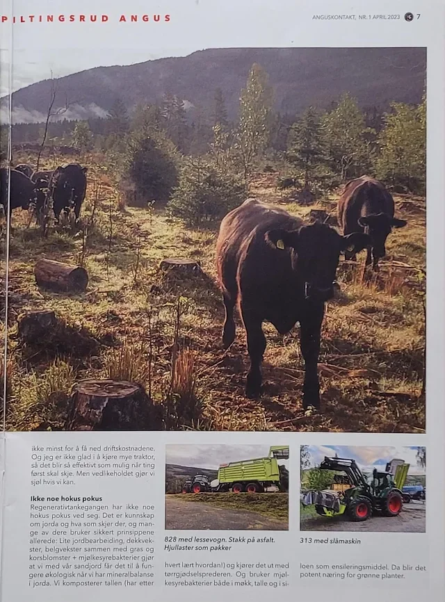Vi legger også stor vekt på engfornying med minst mulig inngrep. Direkte såing og bruk av kløver i frøblandingene bidrar til naturlig nitrogenbinding, bedre jordstruktur og økt motstandskraft i enga. Målet er et sunt gras med høyt næringsinnhold, tilpasset dyra våre og lokale forhold.